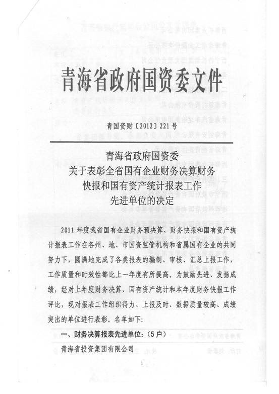 2012年,在集团及所属各公司领导的高度重视下,在所属各公司的大力支持和密切配合下,在辛勤事情在财务会计岗位上的同事们的配合努力下,集团总公司圆满完成了省国资委和省财务厅种种报表的上报事情,财务信息事情质量、时效性和财务剖析水平都比上一年度有所提高,受到了省国资委和省财务厅的好评,集团总公司2011年度财务决算事情被省国资委评为先进单位,集团财务审计部张莉青同志被省财务厅评为2012年度财务快报事情先进个人。